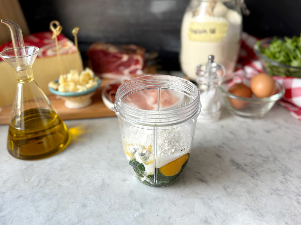 2️ Nel boccale del mixer unisci spinaci lessati e ben strizzati, uovo, farina, latte, acqua, sale e un filo d’olio. Frulla fino a ottenere una pastella liscia e omogenea (aggiungi un goccio di latte se necessario).