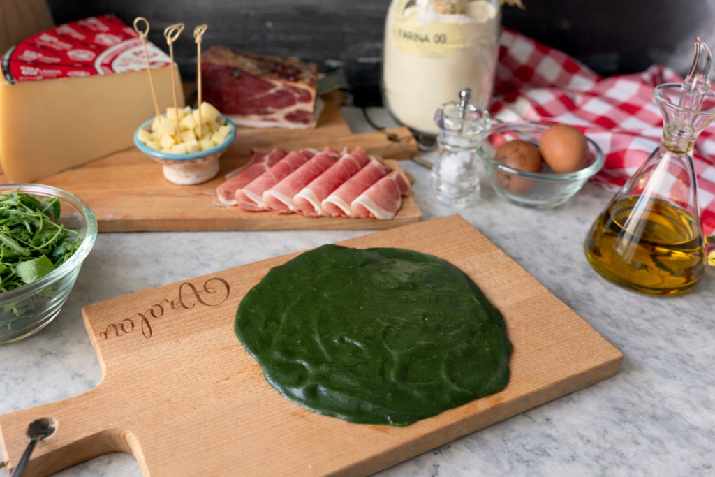 4️ Farciscile con Speck Alto Adige IGP, Formaggio Stelvio DOP, rucola e completa con un filo d’olio.