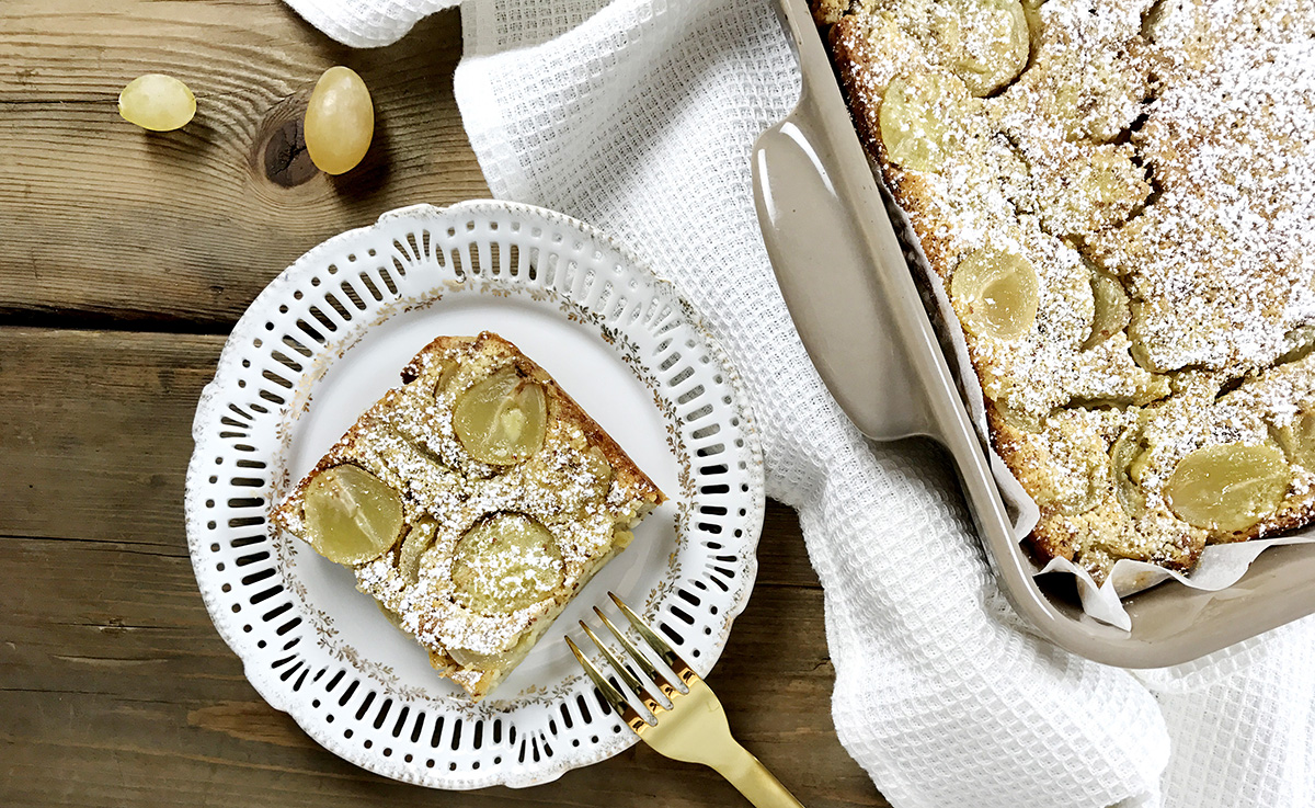 Imburrate una pirofila o una teglia, disponete gli acini d’uva e versatevi sopra la pastella preparata, distribuendola molto bene.
